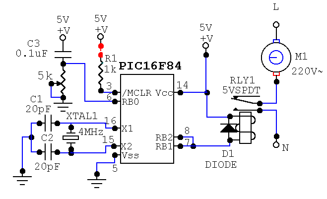 A simple controller for ventilation fan was made by using a PIC16F84 chip. A 5k variable resistor provides latching input for time on setting. RB2 and RB1 are activated to logic '0' every 10 min. The variable resistor, 5k, is used to set the period of logic '0' ranging from 1 min to 10 min.